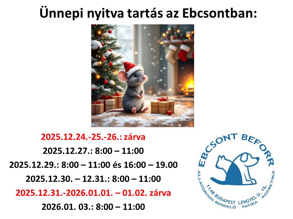 Vigyázzunk kedvence egészségére! Látogassa meg rendelőnket, foglaljon időpontot! Foglaljon időpontot! Üdvözöljük az Ebcsont Beforr Állatorvosi Rendelő oldalán! Sok éves szakmai tapasztalattal és magas szintű műszeres felszereltséggel várjuk a gyógyulni váró pácienseket zuglói állatorvosi rendelőnkbe. Kérdése van? Sürgős? Hívjon minket! Speciális szolgáltatásaink Egzotikus állatok ellátása Kardiológiai kivizsgálás Ultrahang diagnosztika Labordiagnosztika Állatpatika, fiziológiás- és gyógytápok, felszerelések Ha nem szeretne várakozni, foglaljon időpontot! KÓRELŐZMÉNY Megkönnyítheti munkánkat, ha emailben előre beküldi számunkra a fontosabb kórelőzményi információkat. Beküldöm Ismerj meg minket! Dr.Hegedüs László klinikus állatorvos Dr. Grunzac Kurkó Eszter Dr. Szentmihályi Gábor klinikus állatorvos Pedro, Robi, Vadócka, Jenőke Foglaljon időpontot rendelőnkbe! Aktualitások Új vérgázanalizátor az Ebcsontban! Időpontfoglalási lehetőség az Ebcsontban! Ebösszeírás 2025-ben!